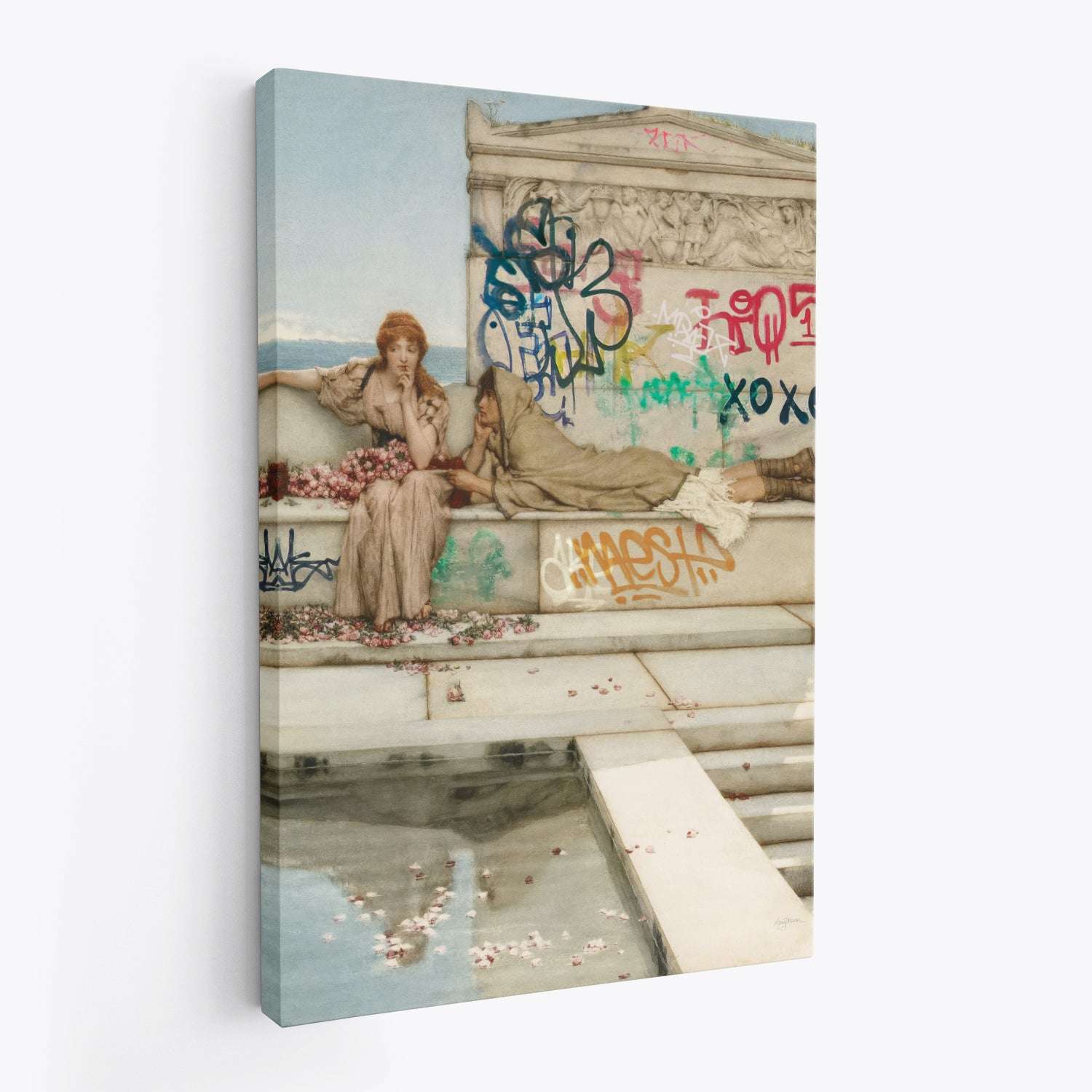 Antiquity Graffiti by Mary Urban blends timeless classical romance with punchy street-art rebellion. Two figures lounge beside scattered roses and a reflective pool, set against an ancient stone backdrop splashed with modern tags—creating a layered, cinematic piece that feels both elegant and unapologetically contemporary.